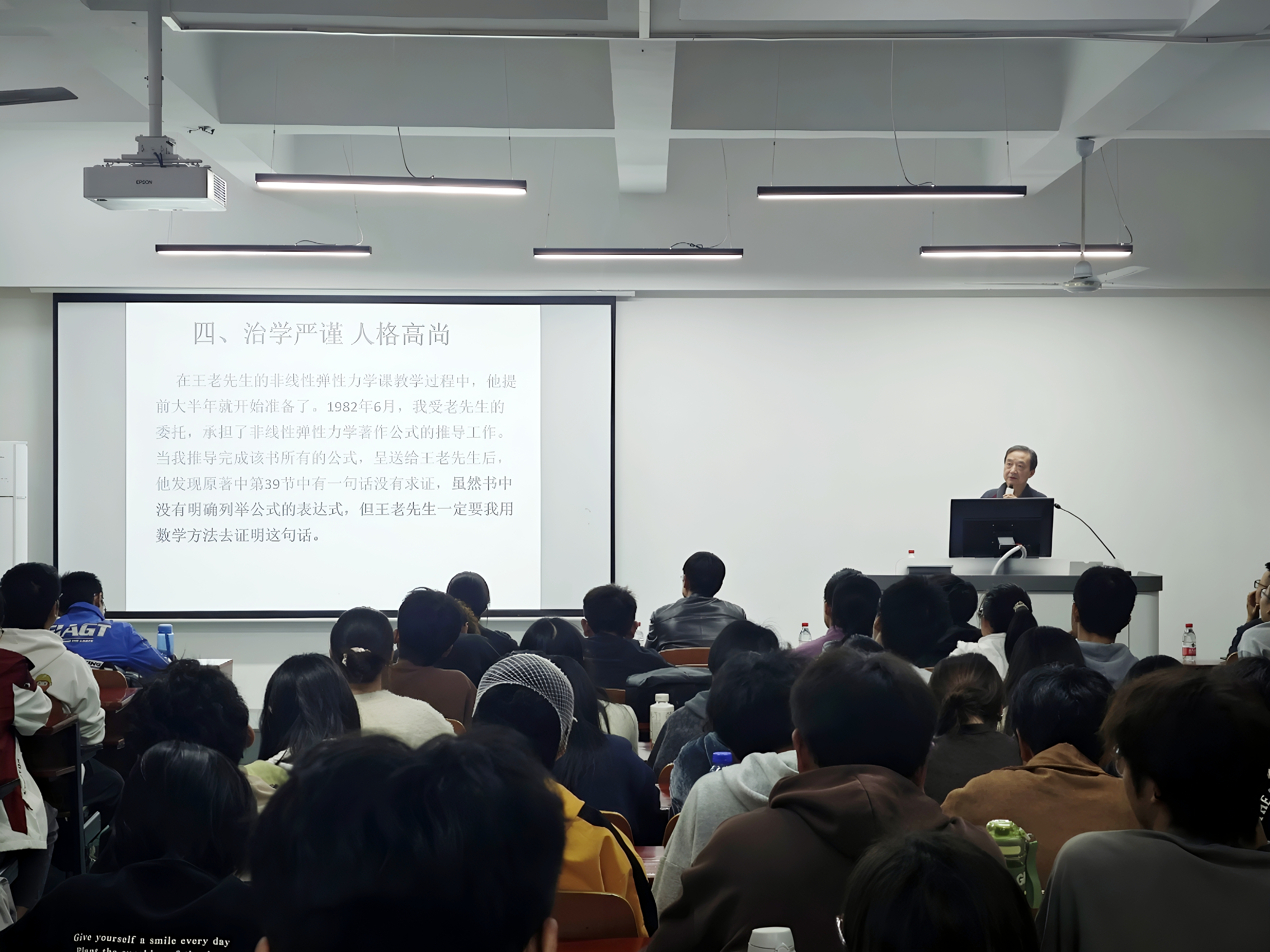 讲座期间,李卓球教授围绕求学经历、学科贡献、治学风范、心理素质四个维度,生动勾勒出王龙甫先生的学术人生与高尚品格。谈及恩师的求学过往,李教授回忆道:王龙甫先生曾远赴海外深造,凭借扎实的学识功底与勤勉的钻研态度,提前完成学业,随后毫不犹豫回到祖国,投身高校教育事业;他以“知识报国”为初心,扎根力学领域的教学与研究工作,数十年如一日,始终未曾动摇。在治学风范方面,始终坚守求真务实的科研底线,倡导严谨细致的治学态度,反对浮躁功利的学术风气。李教授特别分享了一则体现王老先生廉洁正直的细节:当退休金上调后,老先生第一时间主动与组织联系,将过往未按新标准缴纳的党费逐一补齐,用实际行动诠释了对党组织的赤诚之心。李教授坦言,自己的学术道路与人生选择深受恩师影响,从治学严谨的态度到为人处世的准则,都以王老先生为榜样,言语间满含对恩师的崇敬与感念,也让在场学子深切感受到老一辈学者的家国情怀与人格力量。